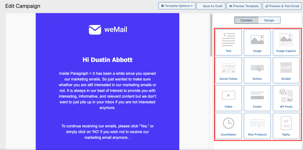 Ayrıca hazır e-posta şablonu, markanız veya işletmeniz için uygun formatta olmayabilir. Bu durumda, e-posta şablonunu özelleştirmek ve işletme türünüze göre bir yapı vermek isteyebilirsiniz. İyi haber şu ki, weMail bunu herhangi bir kod uygulamadan veya herhangi bir zorlukla karşılaşmadan kolayca yapalım.