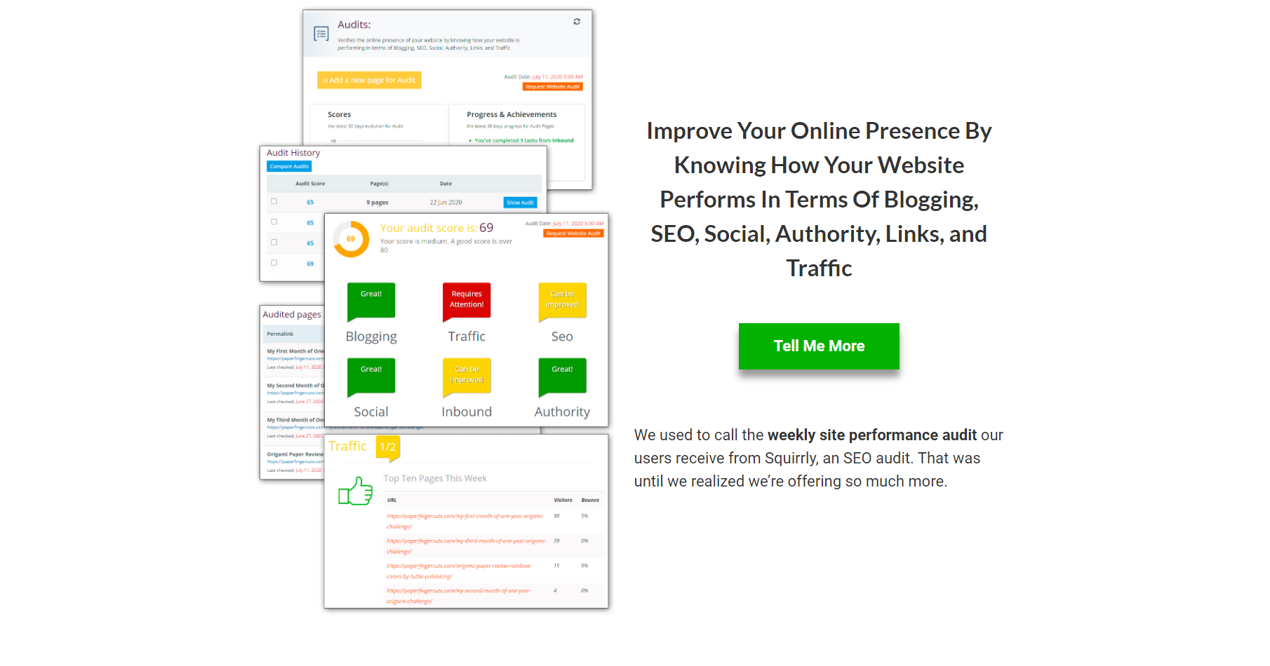 Sayfanız Squirrly tarafından denetlendiğinde, web sitenizin tam performans dökümünü alacaksınız. Performansınızı daha iyi ölçebilmeniz için sosyal medya paylaşımlarının sayısı, Alexa sıralaması, geri bağlantılar, trafik ölçümleri ve daha birçok performans göstergesi gösterilecektir. Daha fazla bilgiye ihtiyaç duyulursa, gelişmiş Google SERP kontrol aracı size web sitenizin zaman içindeki performansına ilişkin bir genel bakış sunacaktır.