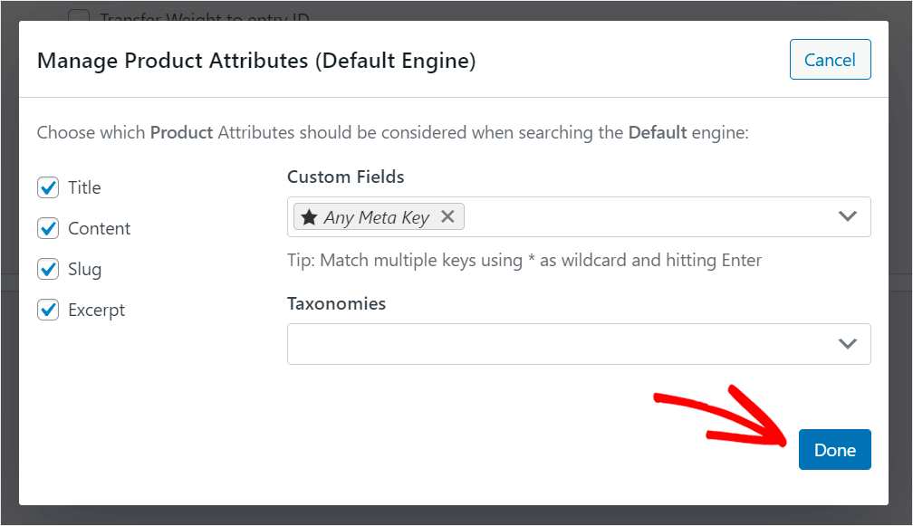 Herhangi bir Meta Anahtar, herhangi bir özel alanı otomatik olarak aranabilir hale getirmenizi sağlayan SearchWP kısayoludur. İsterseniz belirli özel alanların adlarını da girebilirsiniz.