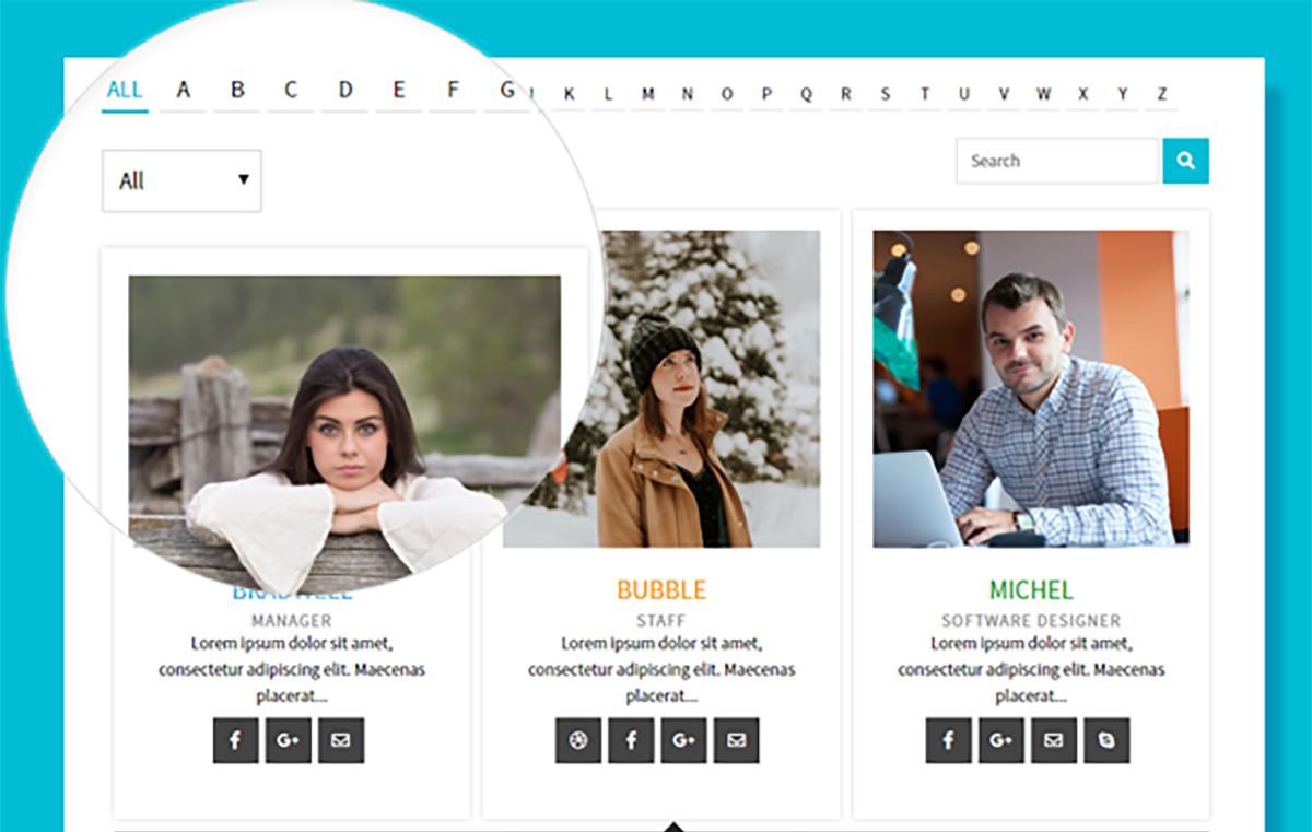 TeamPress 附带一个简码生成器,可以快速轻松地创建简码。 如果你想使用砖石布局,你可以在这个插件的帮助下做到这一点。 它提供搜索、类别过滤器、Ajax 字母过滤器和加载更多分页。 这简单且组织良好,可以轻松访问特定的配置文件或信息。
