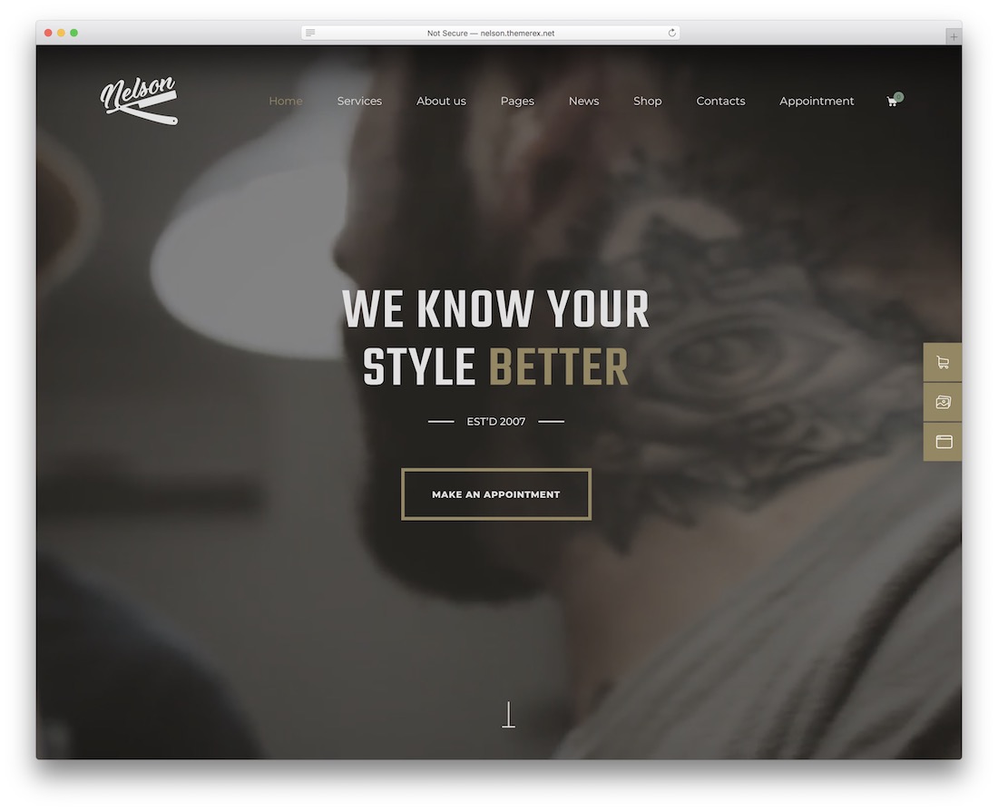 尼尔森是一个特殊的主题与预约理发店和纹身工作室。 凭借黑暗、大胆和有影响力的网页设计,保证您将建立强烈而持久的第一印象。 提示,您也可以使用灯光模式。