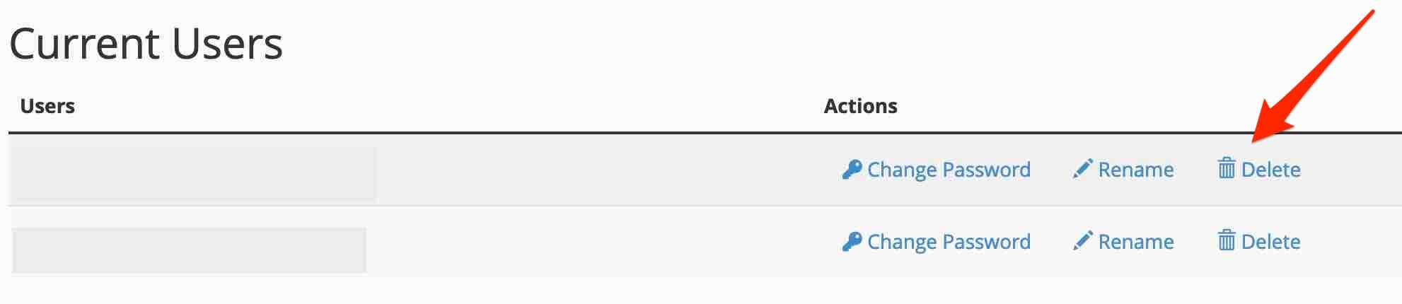 还要记住删除与您的数据库关联的用户。 您可以在同一页面底部的“当前用户”部分找到它们。 再次单击您选择的用户旁边的“删除”。