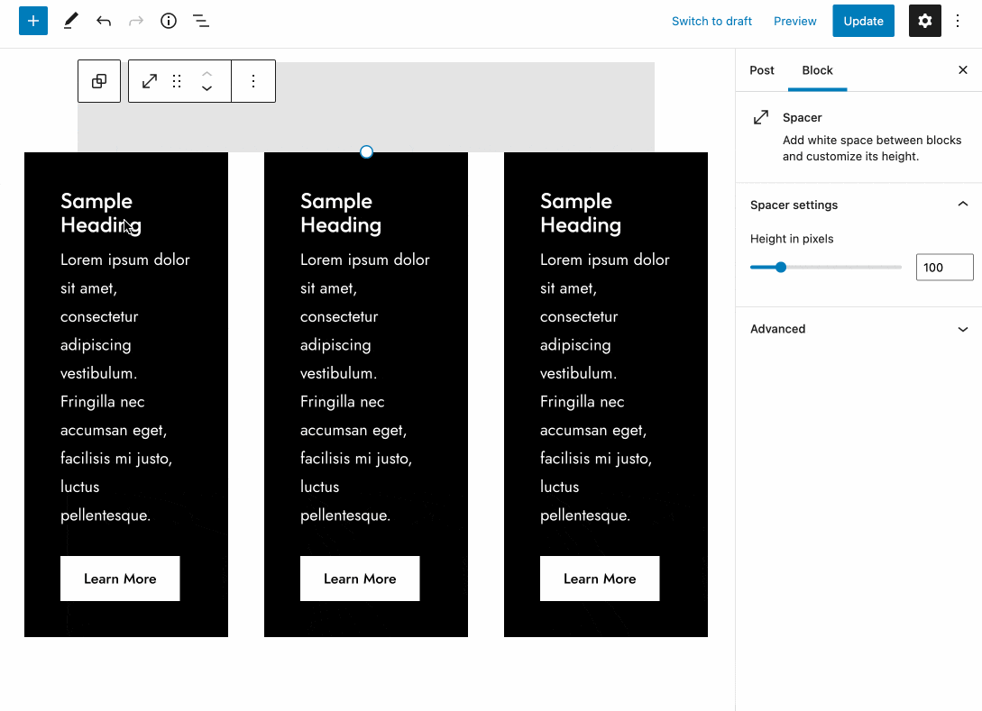 这些是即用型内容部分,由几个 Gutenberg 块组成。 您可以通过单击“模式”选项卡(在站点编辑器中,或在编辑页面或文章时)轻松地将它们添加到您的内容中: