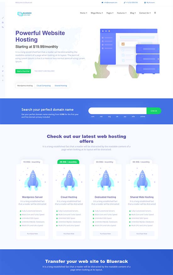 Bluishost 是一个响应式网络托管主题和 WHMCS,专为所有类型的技术、域托管和托管而设计。 多才多艺的。 Bluishost 是技术和软件公司以及基于 Visual Composer 的网络托管公司的主题。 该主题包括托管服务公司所需的所有功能,包括域搜索和注册功能。 还包括一个基于 WHMCS v7.7.x 的 WHMCS 自定义模板,可单独使用。