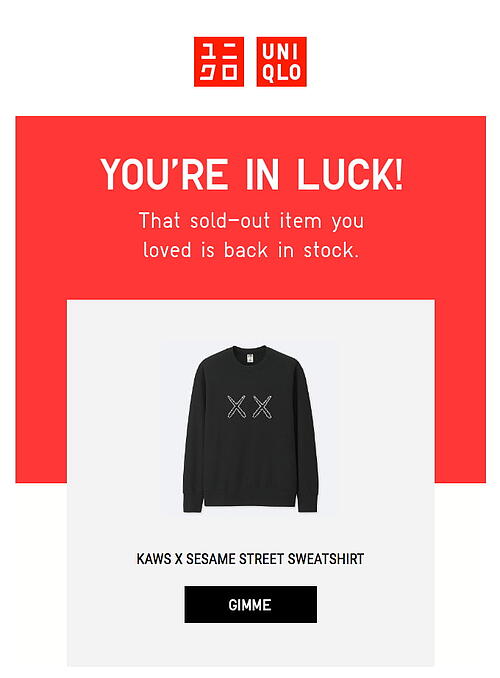 许多公司为客户提供在缺货商品重新上架时收到通知的机会。 如果该项目返回时,该列表会收到一封“有货”电子邮件。 这种电子邮件格式专注于一种产品,应该在客户中产生感激或紧迫感。