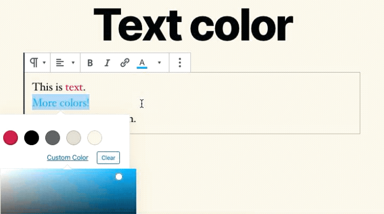 更新到 WordPress 5.4 的另一个重要原因是颜色选项更加自由。 只需选择任何短语并通过方便的颜色选择器更改它们的颜色,您就可以将内联文本颜色添加到富文本块中。 现在不需要 HTML 模式。 也可以设置块组的背景颜色。 此外,还有几个块(按钮、封面、组、列)中可用的渐变背景。