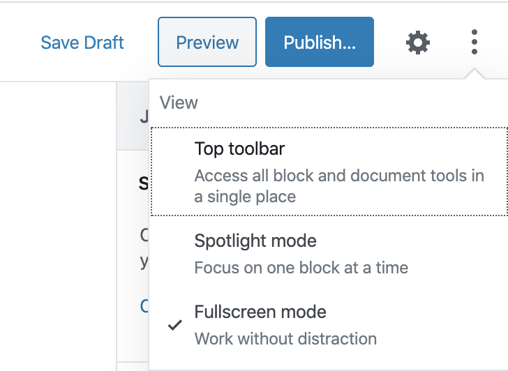 更新到 WordPress 5.4 后会出现该模式,但如果您单击编辑器右上角的菜单,则可以随时调用它。