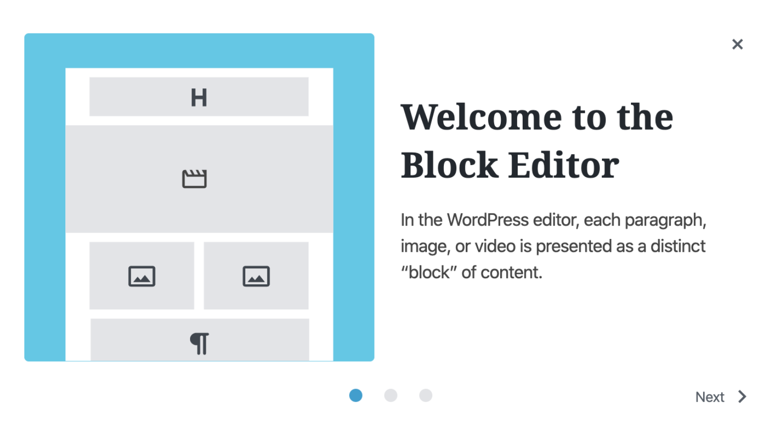 在 WordPress 5.4 中,我们看到了一个新的欢迎指南模式,它为用户提供了 Gutenberg 编辑器的小导览。 这是一个幻灯片,其中包含有关 Gutenberg 块的解释、块库的邀请以及对官方文档的参考。