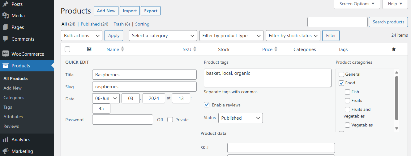 当然,某些商店可能会使用在其他商店中属于类别的标签。 例如,让我们想象一家出售食品的 WooCommerce 商店。 可以根据类别和子类别(乳制品(牛奶、酸奶、黄油)、肉类(牛肉、鸡肉、猪肉)、鱼、蔬菜、水果等)来构建产品。