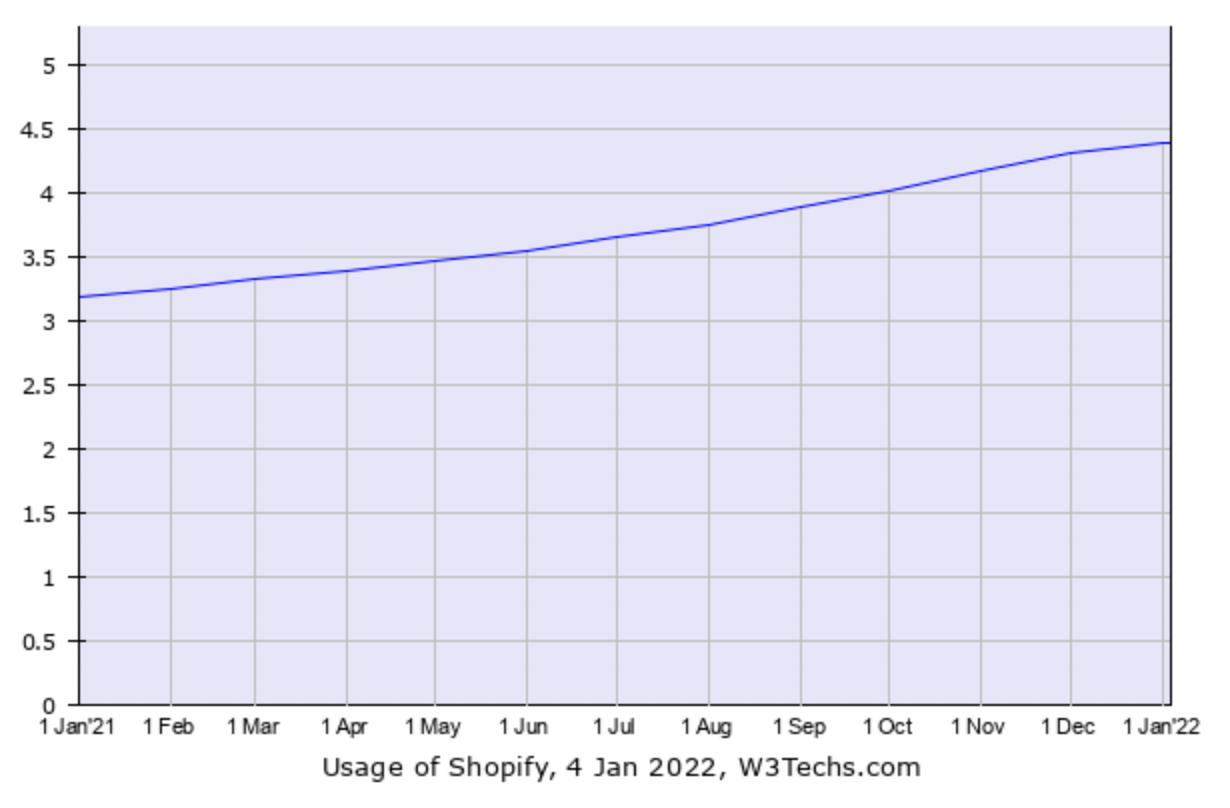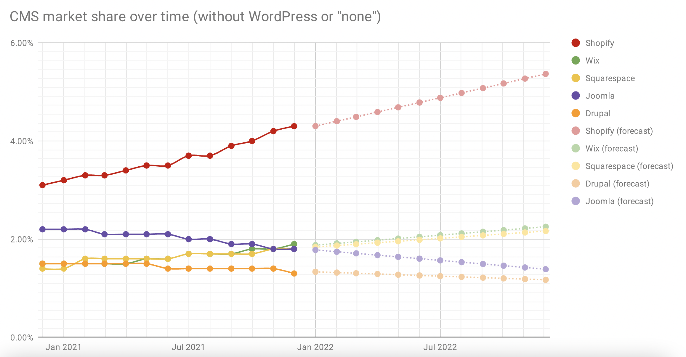 根据 W3Techs 的 2021 年数据,Shopify 是增长第二快的 CMS,在 4.4% 的网站上使用,高于去年的 3.2%。 下一个最接近的竞争者 Wix 在 2021 年放弃了 Joomla 和 Drupal,进一步推动了托管、封闭源代码软件平台掩埋开源 CMS 的趋势。