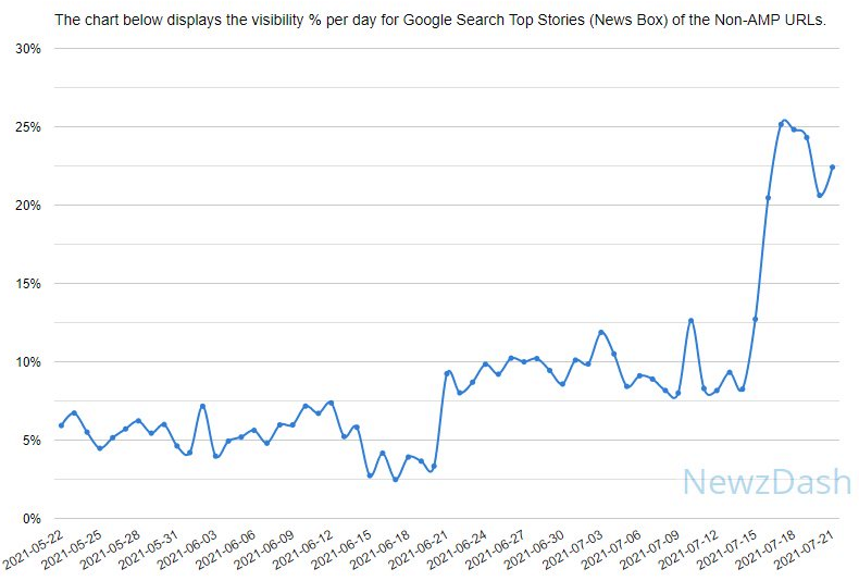 Barry Adams 是 AMP 項目最直言不諱的批評者之一,他在圖表中向出版商展示了這一成本,該圖表顯示了美國谷歌移動熱門故事輪播中非 AMP 文章的百分比。 當谷歌在 2021 年 7 月停止要求 AMP 用於移動頭條新聞時,包含的非 AMP 網址急劇增加。