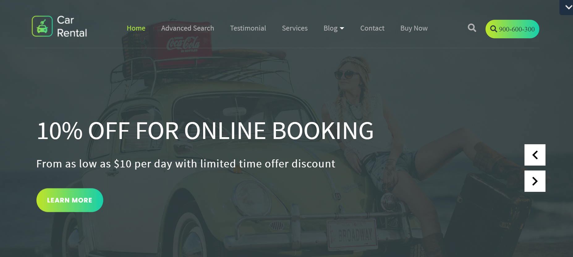該主題的構建考慮了汽車租賃業務,因此它為您提供了使您的租賃業務上線所需的一切。 主頁上的全屏滑塊是網站的主要吸引力中心,您可以在其中展示和推廣主要服務和其他吸引人的促銷活動。