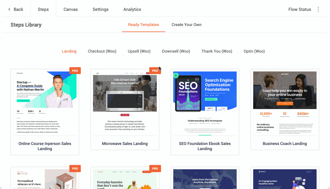為了讓您的生活更輕鬆並儘可能快地創建銷售漏斗,Cartflows 提供了近 40 個可供使用的模板,其中十幾個是免費的(無需通過 Pro 版即可使用)。