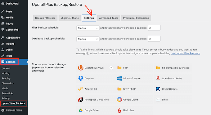 為此,請轉到 WordPress 儀表板中的設置»UpdraftPlus 備份。 然後,只需單擊“設置”選項卡。