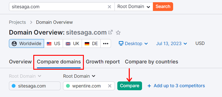 此外,您還可以在“比較域名”部分輸入您的域名和其他競爭對手的域名。 然後,單擊“比較”按鈕。 這以比較的形式概述了您和那些競爭對手的表現。