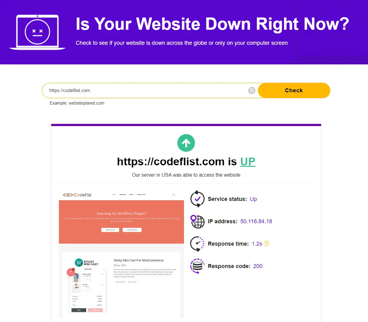 您將能夠使用 Website Planet 工具查看特定站點當時是啟動還是關閉。 如果網站正在運行,則輸入 URL 後,您將看到不同的詳細信息,例如 IP 地址、響應時間和鏈接到該站點的響應代碼。