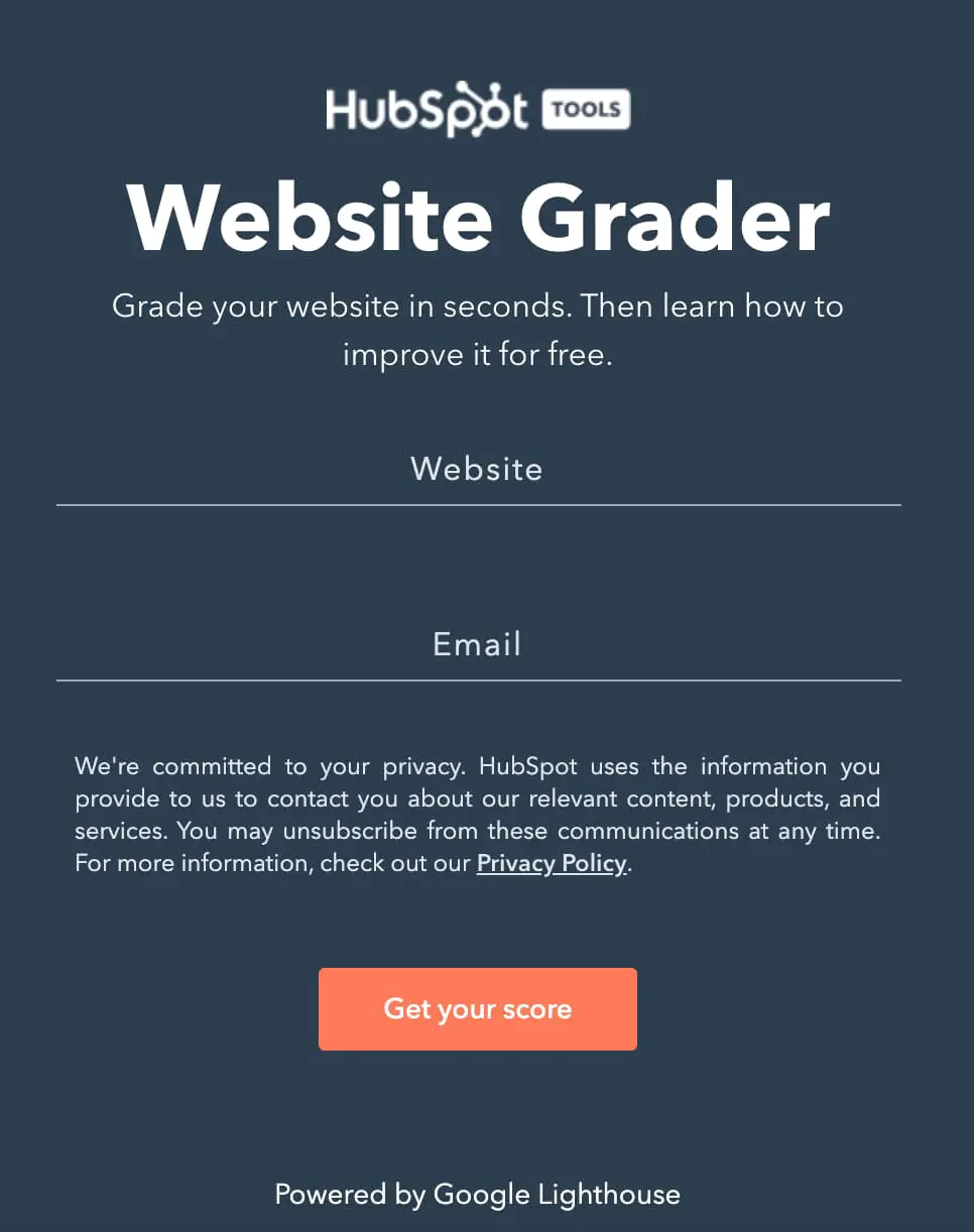 HubSpot 提供網站評分器,只需幾秒鐘即可掃描您的網站,並根據性能、移動體驗、SEO 和安全性提供評分。
