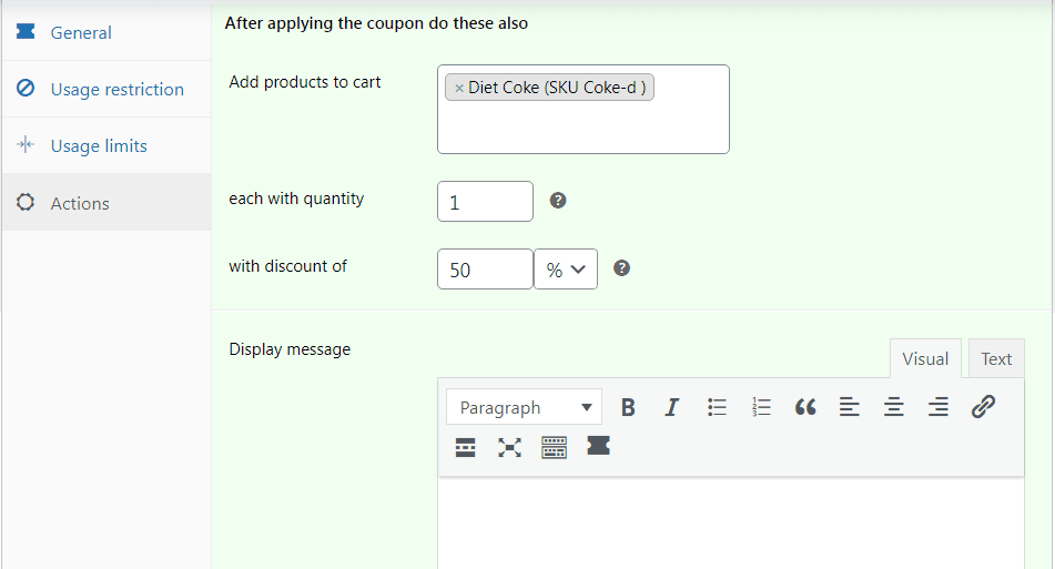 同樣,要遵循與上述類似的步驟。 更換產品並更改“操作”選項卡下的折扣值,如下所示。